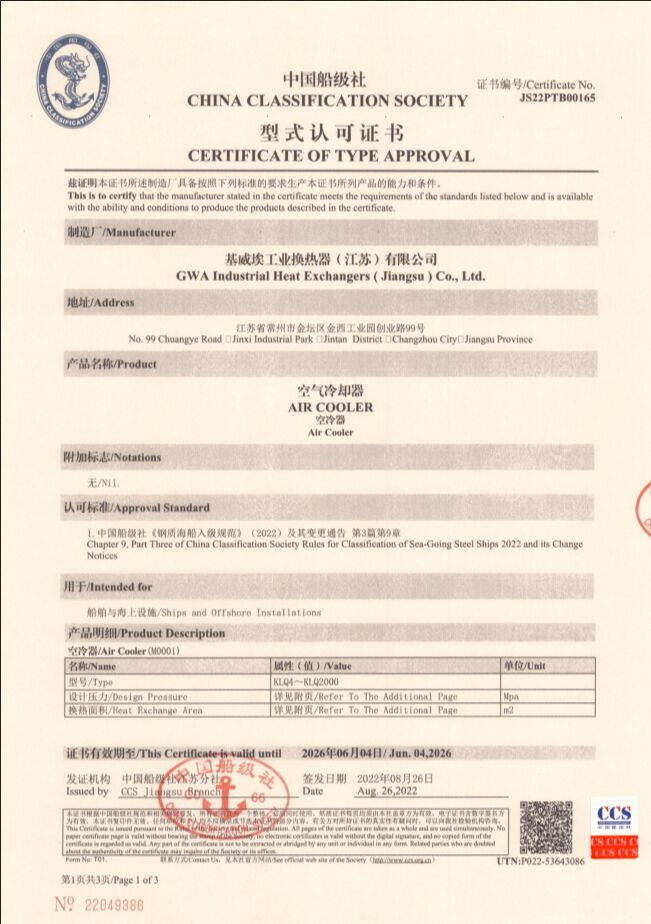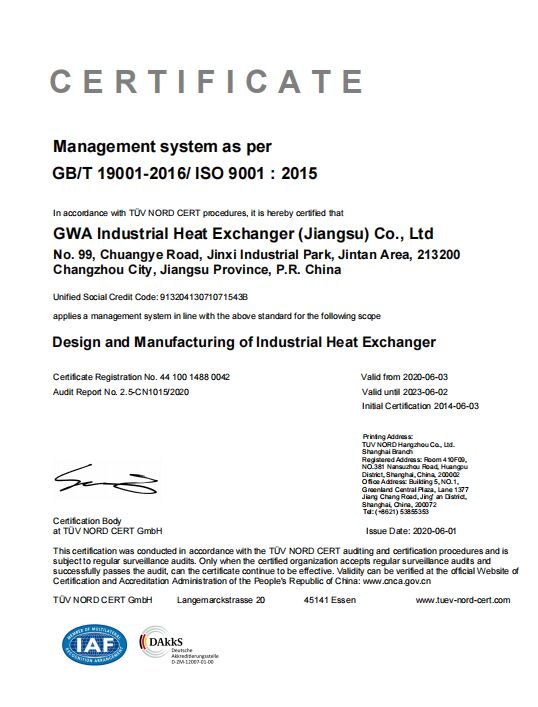 GWA industrial heat exchangers ( Jiangsu ) Co., Ltd. Add: 99 #Chuangye Road, Jinxi Industrial Park, Jintan District, Changzhou City, Jiangsu ProvincePhone: +86 (0) 519-68080926Fax: +86 (0) 519-68080757Phone: 13955382518Website:www.gwachina.com