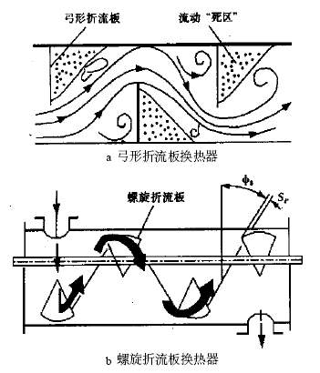 螺旋折流板是将传统的垂直弓形板换成螺旋状或近似螺旋状的折流板,折流板与换热器壳体横断面有一个倾斜角度,使得流体在壳程沿螺旋通道流动。按流道多少螺旋折流可分为单头或双头。图1为流体在弓形折流板和螺旋折流板换热器壳侧流动情况对比的示意图如下。