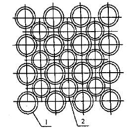空心环支承结构是采用空心环网板取代折流板做管间支撑物。空心环由直径较小的钢管截成短截,均匀地分布于管间的同一截面上,与管子呈线性接触,使管束相对紧密固定而成。空心环支承传热管束的示意图如图3所示。采用空心环管间支承可大幅减少气体因在壳程作反复折流而损失的流体输送功,依靠增加管间气速提高管外传热膜系数,达到流体输送功的用。二是采用粗糙型传热管,如缩放管、低肋管、花瓣管等,强化流体纵向冲刷时的对流换热。图3空心环支承传热管束示意图
