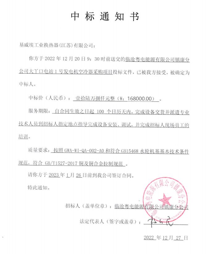 您当前所在的位置是:首页 >> 产品与服务>> 大丫口1号机空冷器采购中标通知书